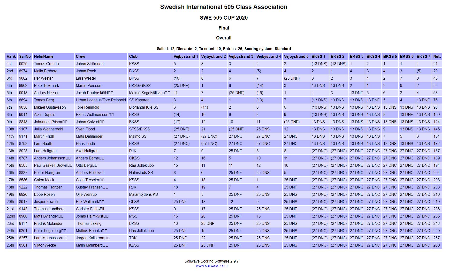 SWE 505 CUP 2020 skulle som sagt varit Robline SWE 505 CUP, men Robline tvingades lägga ner alla partnerskap, pga. pandemin. Tack ändå för ambitionen att samarbetat och för ambitionen att ha ett nytt partnerskap på plats 2021. Seglingsmässigt blev det bara två deltävlingar, eftersom KSSS ställde in Olympic-regattan som skulle varit tredje CUP-seglingen. Båda CUP-tävlingarna gick i tuffa vindar. Hela 26 svenska team deltog i någon av de två regattorna, 12 från region väst, 8 från syd och 6 från ost. En ganska god spridning. Ostkustbesättningarna var i minoritet, men de tog hem segern genom Tomas Grundel/Johan Strömdahl, KSSS, som tog sin tredje inteckning i vandringspriset för SWE 505 CUP. Sedan följde tre besättningar från Västkusten - Malin Broberg/Johan Röök, BKSS slutade tvåa och Per och Lars Wester, BKSS blev trea. Bästa båt från syd blev Anders Nilsson/Jonas Reuterskiöld. Malmö SS, på plats 5 totalt. Vinnare av SWE 505 CUP Classic 2020 blev ostkustbesättningen Lars Magnusson/Jörgen Källström i SWE 8257. Resultatlistan för 2020 års SWE 505 CUP finns här. Resultat från alla års SWE 505 CUP finns på www.int505.se – klicka på resultat i vänster spalt.
